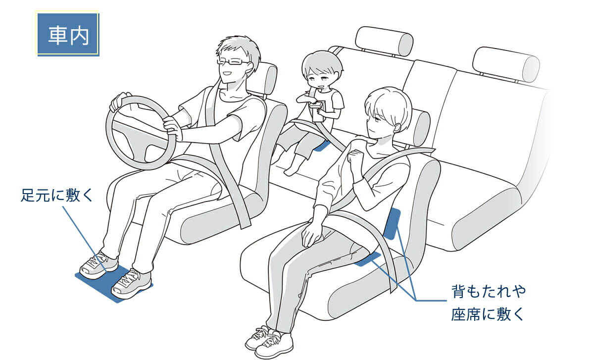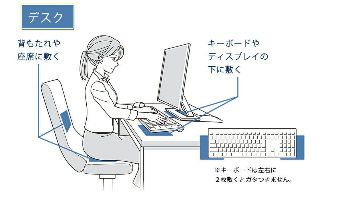 パソコン作業をするデスクの椅子に敷いたり、社内では足元や座席に敷くことで電磁波から守ります。