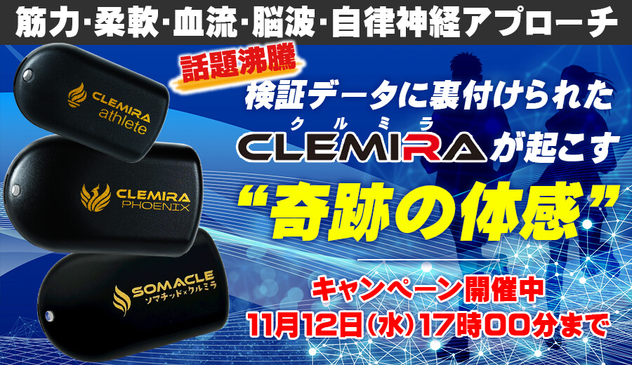 | 注意事項 | ・CLEMIRAは医療機器ではなく、特定の症状や疾患に対する効果・効能を保証するものではありません。 製品のご使用に関しては、お客様ご自身の判断・責任のもとでお願いいたします。 ご使用中に体調の変化などを感じられた場合は、直ちに使用を中止し、医師などの専門家にご相談ください。 ・強い衝撃を与えないでくださいケースが破損します。 ・多少の水濡れは問題ありませんが生活防水程度の耐水レベルです。 濡れた場合はよく乾かしてからご使用ください。 ・オーバーワークにご注意を。 ソマクルを着用しますと身体が動くためつい無理をしがちです。 今までと同じ運動量にとどめていただき休憩を十分にとるようにしてください。 ソマクルは従来品に比べ非常にパワーが強いため使用当初は以下の様な反応が起きることが報告されています。 だるさ、痛み、めまい、不眠(中途覚醒など)、現在の不調の一時的な悪化、潜在的な不調の表面化など。 このような反応は個人差があり一過性で概ね3日~3ヶ月程度で収まります。 反応が強い場合はあまりしんどくならないように最初のうちは使用時間を短くして徐々に長く使用できるように時間で調整してください。 万一不安を感じた場合には使用を中止し医師の診断に従ってください。 |