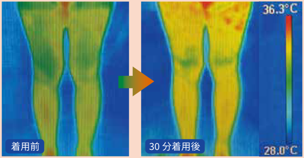 - BOSCH(株)製 放射温度計「GTC400C PROFESSIONAL」にて、着用前と30分着用後のサーモグラフィ(体表温度変化)を比較。