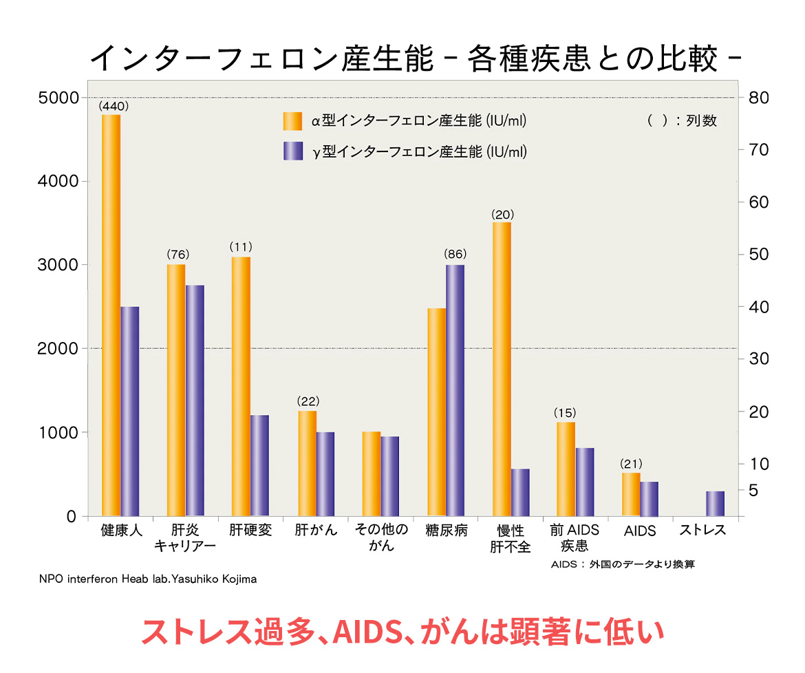 インターフェロンの産生能は、健康の方と病気または高齢者の方を比例すると顕著に差が出ます。