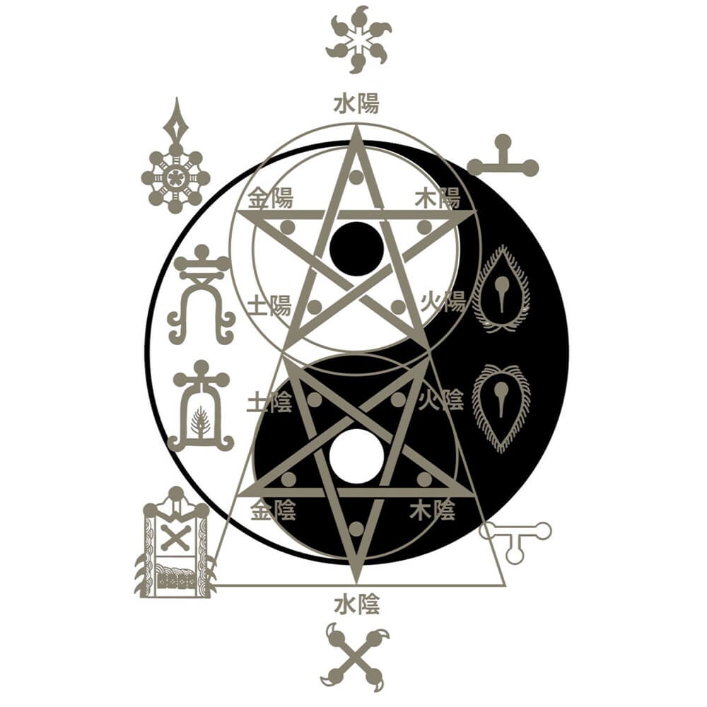 ジュエリーが属する世界である「鉱物エレメントとその相克(五行相克)」の法則をレイヤー(階層化)しています。
